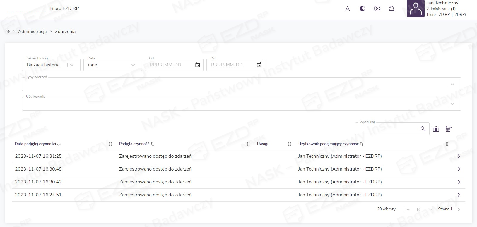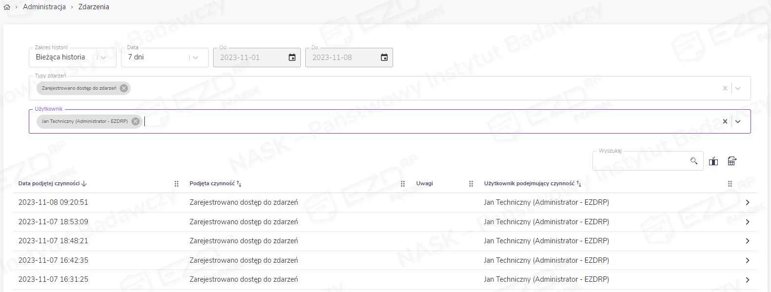 Dziennik zdarzeń dostępny jest w widoku Administracja > Zdarzenia.