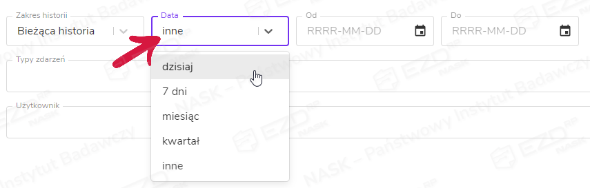 • Data – ograniczenie wyświetlania zdarzeń do pochodzących z konkretnego przedziału czasowego.