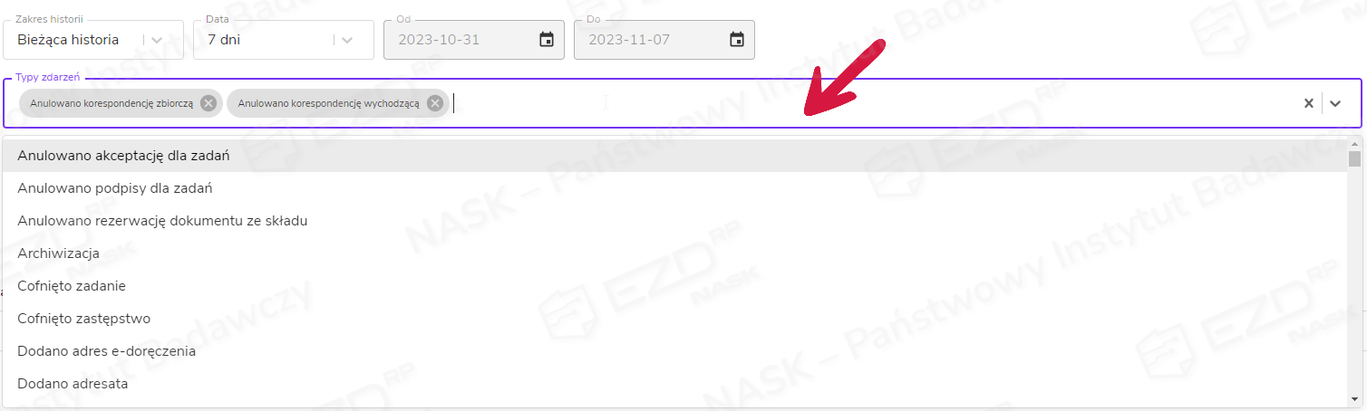 • Typ zdarzenia – możliwość wielokrotnego wyboru z listy typów zdarzeń. Lista zawiera wszystkie możliwe do wykonania operacje.