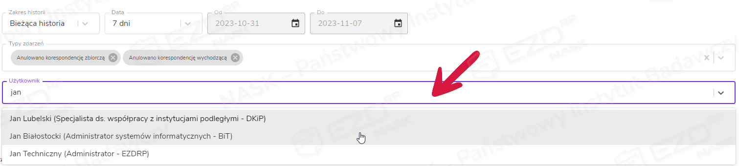 • Użytkownik – możliwość wielokrotnego wyboru użytkowników, przypisane do których zdarzenia mają zostać wyświetlone.