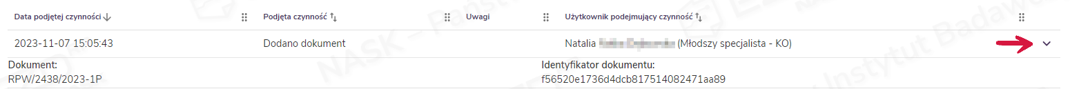 Przy wybranych typach zdarzeń po kliknięciu symbolu rozwinięcia znajdującego się po prawej stronie wiersza możliwe jest wyświetlenie dodatkowych informacji.