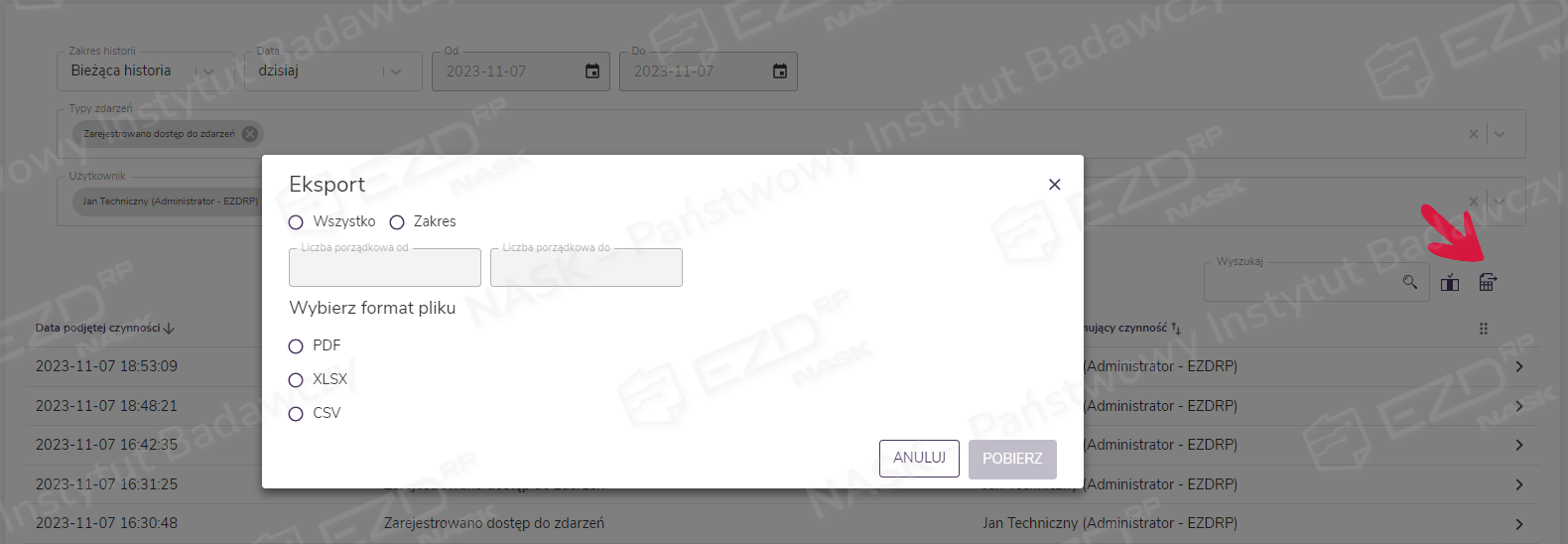 Istnieje także możliwość wyeksportowania wybranych zdarzeń do dalszej analizy. Przy eksporcie powinny zostać zastosowane filtry – ze względu na ograniczenia systemowe oraz możliwości zapisu danych do określonych formatów plików.