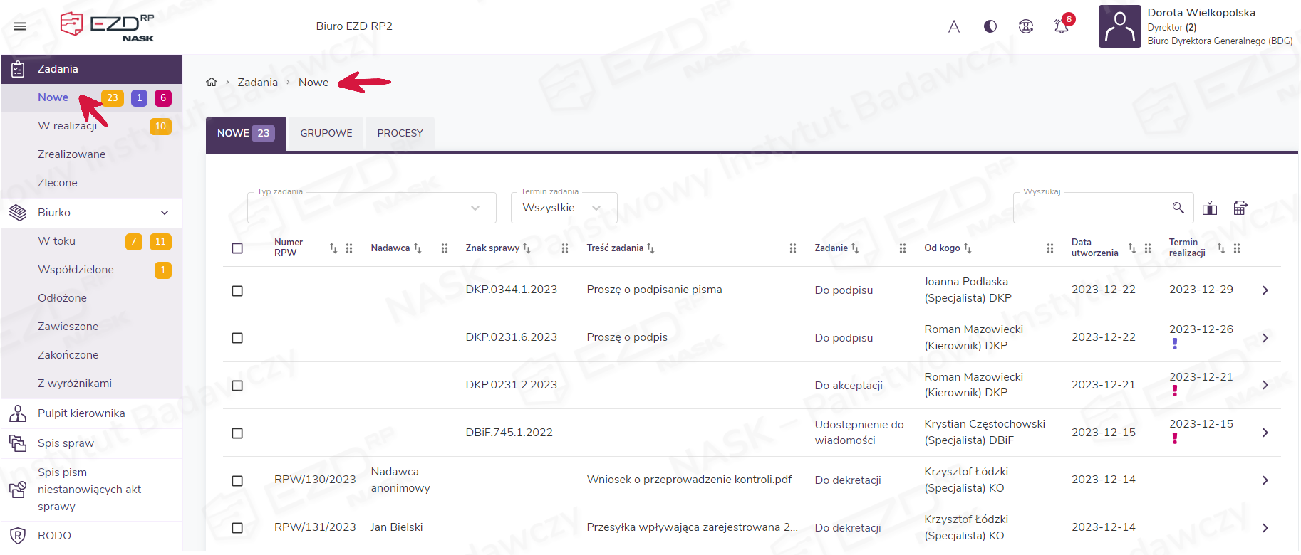 Wszystkie zadania kierowane do użytkownika trafiają do sekcji Zadania > Nowe. Po kliknięciu wskazanej pozycji wyświetli się widok z listą zadań ułożonych od najnowszych do najstarszych.