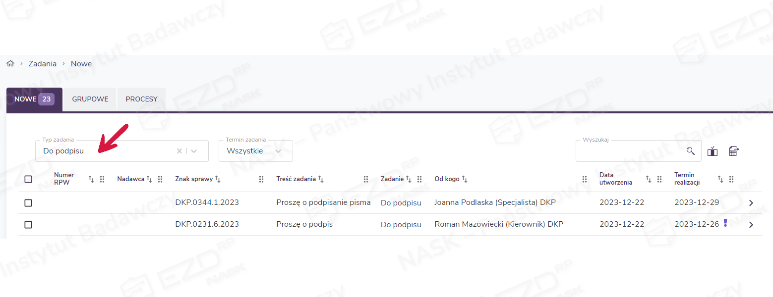 Jeżeli na liście znajduje się dużo pozycji, warto skorzystać z filtrowania dostępnego w polu Typ zadania. Na rozwijanej liście znajdują się wszystkie dostępne w systemie rodzaje zadań, w tym zadania Do podpisu.