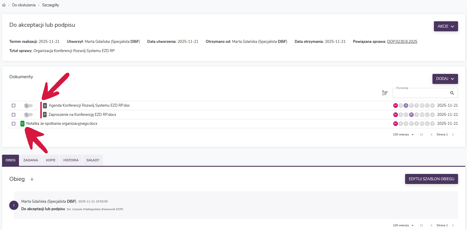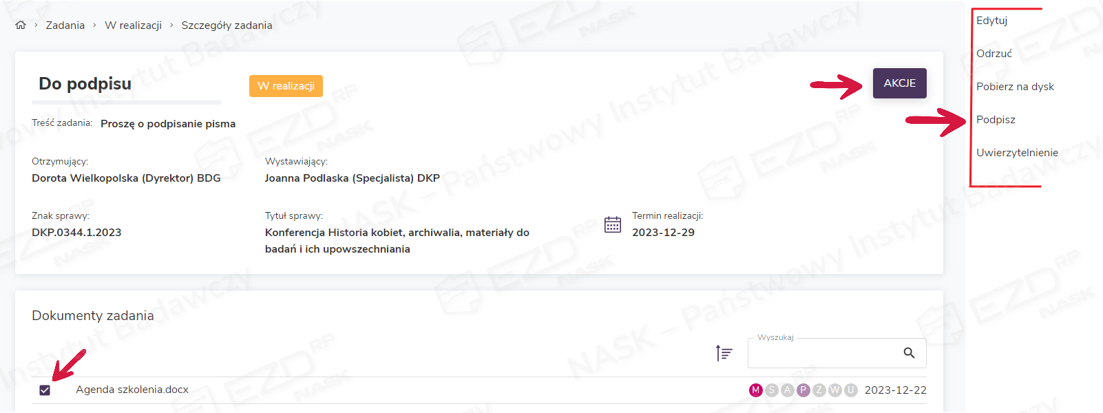 - Zobacz akta sprawy – opcja pozwalająca na zapoznanie się z aktami sprawy, z której zostało wystawione zadanie. Po wybraniu jej w oddzielnej zakładce przeglądarki otworzy się widok danej sprawy. Dzięki temu otrzymujący zadanie może poznać kontekst powstania dokumentu, wobec którego ma podjąć decyzję o akceptacji czy podpisie.