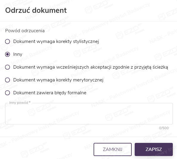 - Odrzuć – pozwala na odrzucenie treści dokumentu z określeniem powodu;