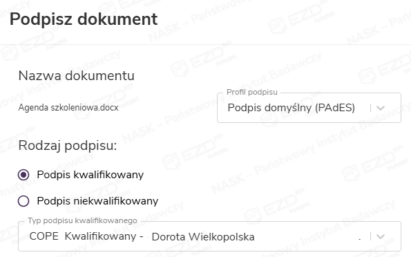 Wyświetlane w tym miejscu rodzaje podpisów mogą się różnić od widocznych na grafice powyżej. System pokaże tylko te, które są dostępne dla danego użytkownika. Z podpisu chmurowego będzie można skorzystać w przypadku, gdy administrator podmiotu wykona odpowiednie konfiguracje w module Administracja.