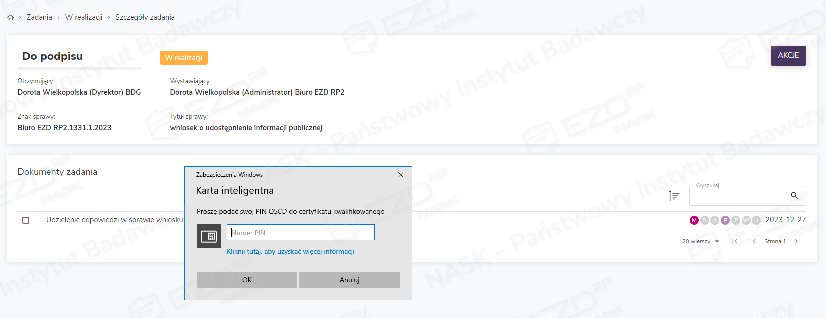 Podpisanie dokumentu z poziomu otrzymanego zadania – dla wariantu systemu oznaczonego literą A