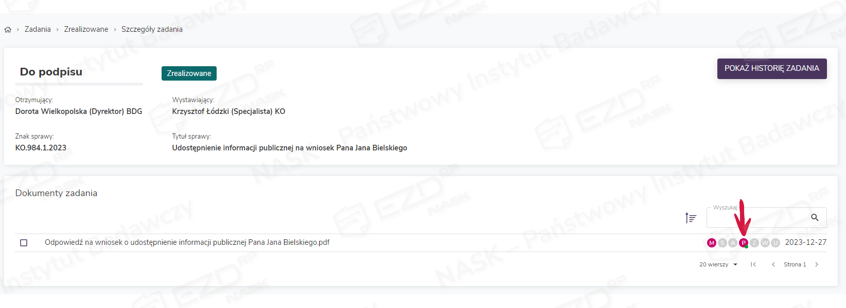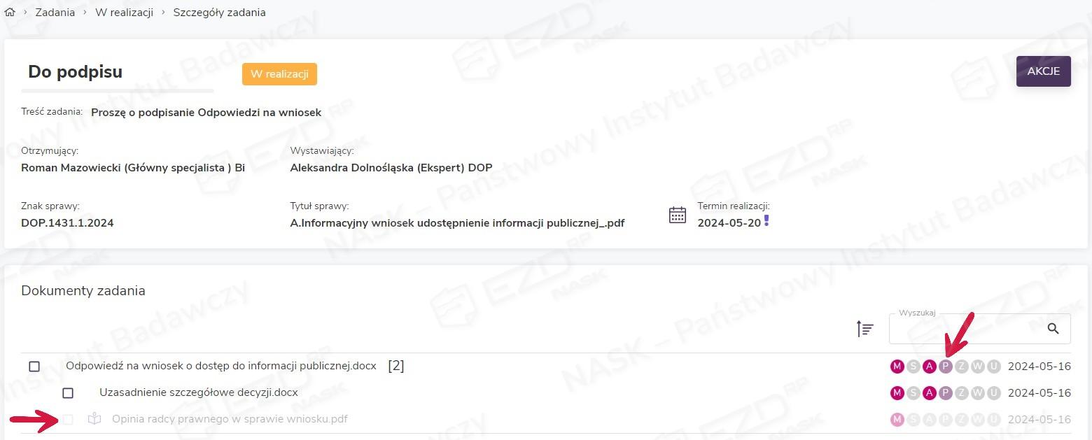 W szczegółach zrealizowanego zadania oraz w aktach sprawy, z której zadanie Do podpisu zostało utworzone, ikona statusu z literą P przy podpisywanym dokumencie zmieni kolor na różowy. Dodatkowo pojawi się na niej zielona kropka. Takie oznaczenie sygnalizuje status weryfikacji podpisu.