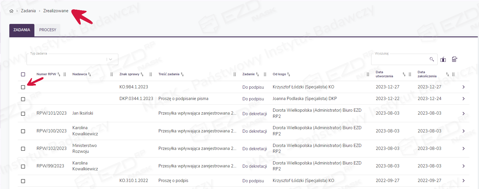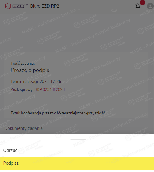 Podpisanie bądź odrzucenie podpisania dokumentu spowoduje przeniesienie zadania do sekcji Zadania > Zrealizowane.