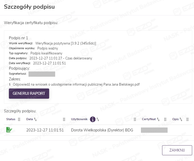 Po kliknięciu ikony wyświetli się panel boczny ze szczegółami podpisu lub podpisów, jeśli było ich więcej. W panelu dostępny jest też przycisk Generuj raport, który pozwala utworzyć raport dotyczący weryfikacji certyfikatu podpisu.