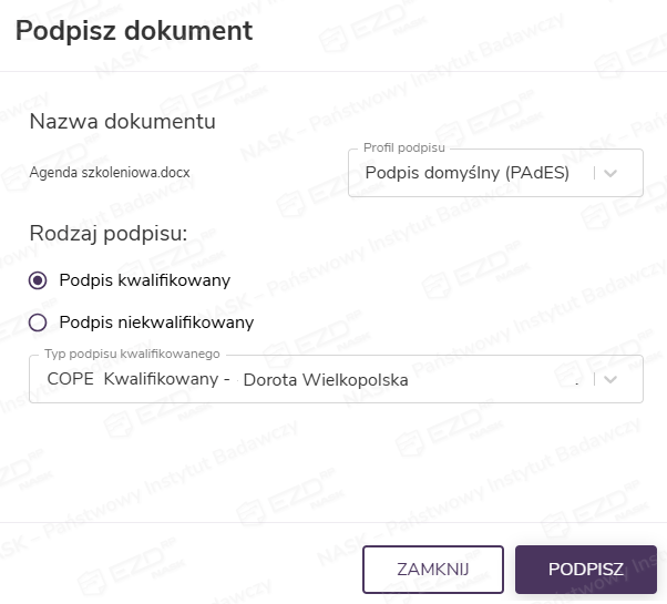 Zadanie do podpisu umożliwia w systemie EZD RP podpisanie dokumentu podpisem kwalifikowanym. Wymaga posiadania uprawnienia do podpisywania w systemie oraz odpowiednio skonfigurowanego podpisu. Więcej informacji w artykułach pt. Konfiguracja podpisu elektronicznego oraz Konfiguracja podpisu elektronicznego w chmurze.