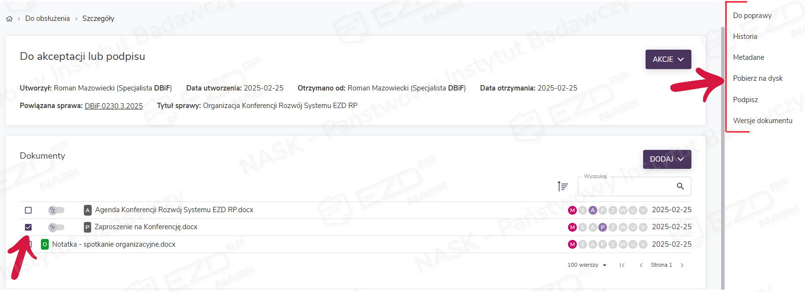 Funkcje dostępne pod przyciskiem Akcje odnoszą się do całego otrzymanego zadania. W celu wykonania czynności na dokumencie, który jest w zadaniu, należy zaznaczyć pole wyboru przy jego tytule. Wówczas z prawej strony ekranu pojawi się menu kontekstowe.