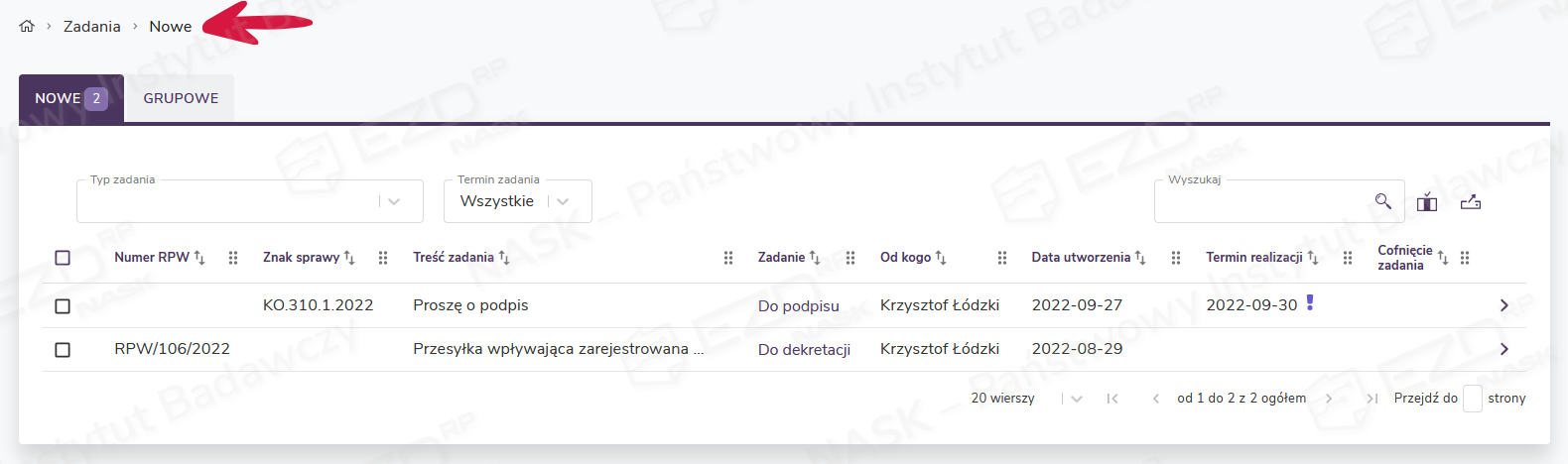 Wszystkie zadania kierowane do użytkownika trafiają do sekcji Zadania > Nowe, do której mamy która za pośrednictwem menu głównego. Po kliknięciu wskazanej pozycji wyświetli się widok z listą zadań ułożonych od najnowszych do najstarszych.