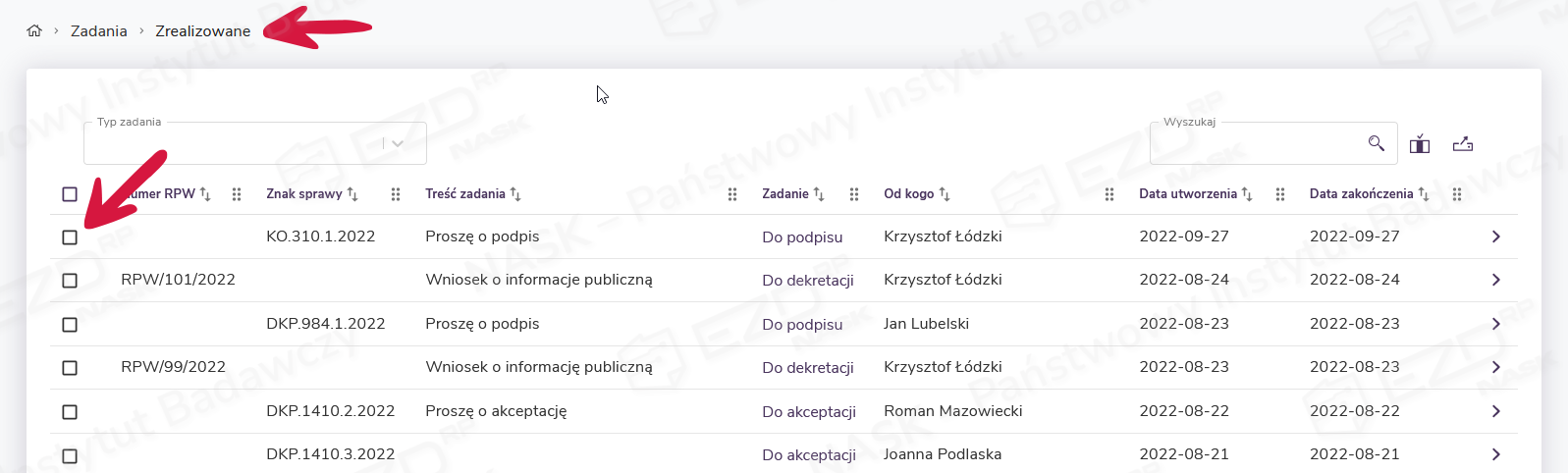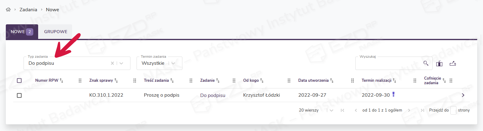 Jeżeli na liście znajduje się dużo pozycji, warto skorzystać z filtrowania dostępnego w polu Typ zadania. Na rozwijanej liście znajdują się wszystkie dostępne w systemie rodzaje zadań, w tym zadania Do podpisu.