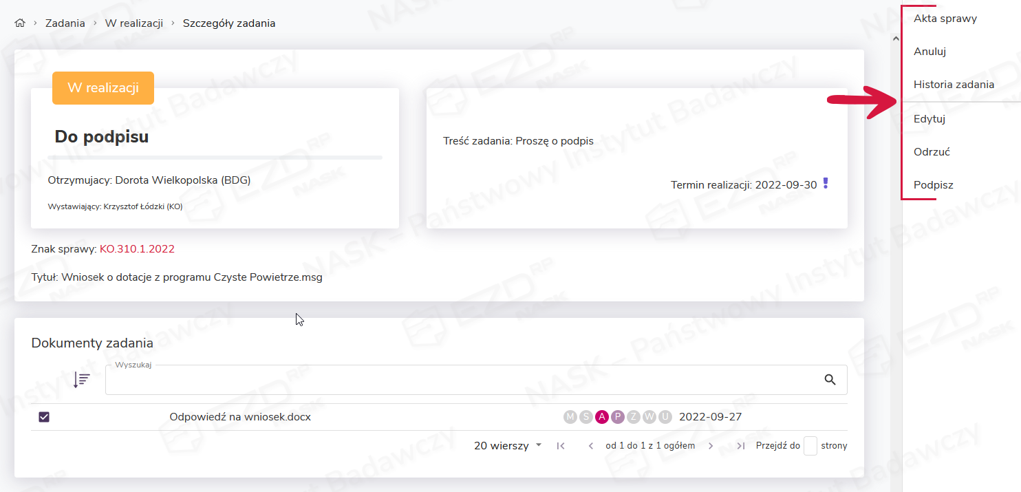Po kliknięciu wybranego zadania zostanie wyświetlony widok z jego szczegółami. Zaznaczenie pola wyboru przy dokumencie lub dokumentach do podpisu spowoduje, że z prawej strony ekranu pojawi się menu kontekstowe z opcjami.