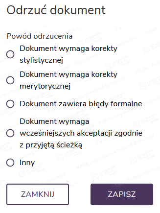 • Odrzuć – pozwala na odrzucenie treści dokumentu z określeniem powodu.