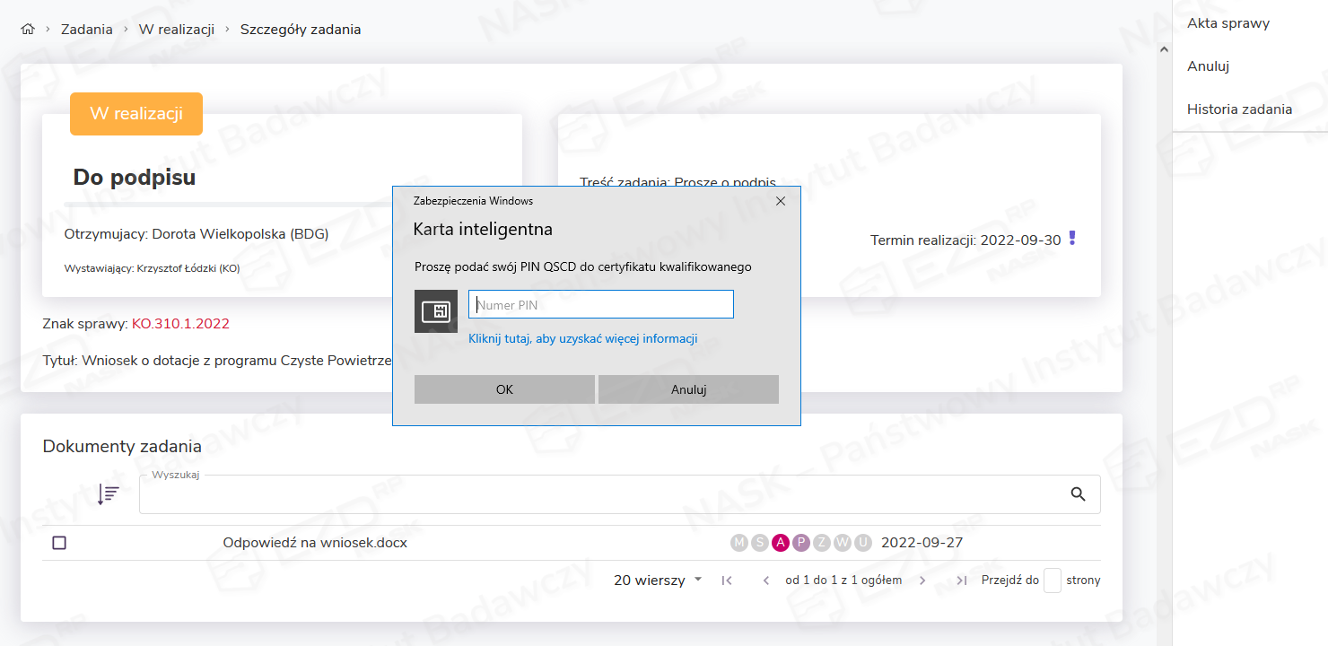 Podpisanie dokumentu z poziomu otrzymanego zadania (dla wersji 17)
