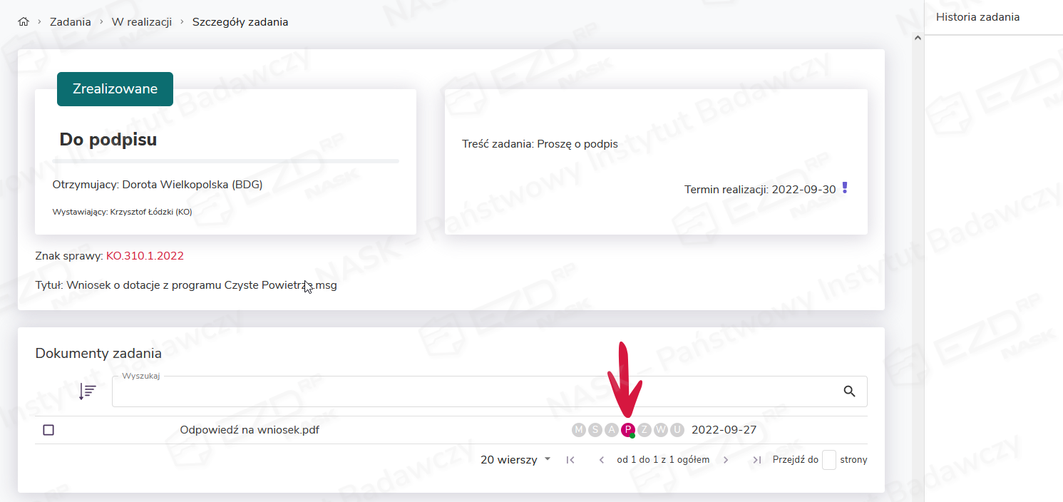 W szczegółach zrealizowanego zadania oraz w aktach sprawy, z której zadanie Do podpisu zostało utworzone, ikona statusu z literą P przy podpisywanym dokumencie zmieni kolor na różowy. Dodatkowo pojawi się na niej zielona kropka. Taka ikona sygnalizuje status weryfikacji podpisu.