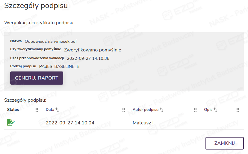 Po kliknięciu ikony wyświetli się panel boczny ze szczegółami podpisu lub podpisów, jeśli było ich więcej. W panelu dostępny jest też przycisk Generuj raport, który pozwala utworzyć raport dotyczący weryfikacji certyfikatu podpisu.