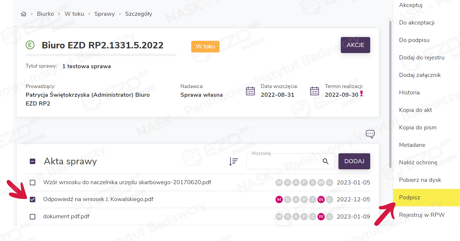 Po ustawieniu parametrów podpisu elektronicznego przechodzimy do sekcji Biurko > W toku > Sprawy. Zostaje wyświetlona lista spraw. Użytkownik wyświetla akta danej sprawy, klikając znak sprawy. Następnie zaznacza pole wyboru przy dokumencie, który ma być podpisany i z menu kontekstowego po prawej stronie ekranu wybiera funkcję Podpisz.