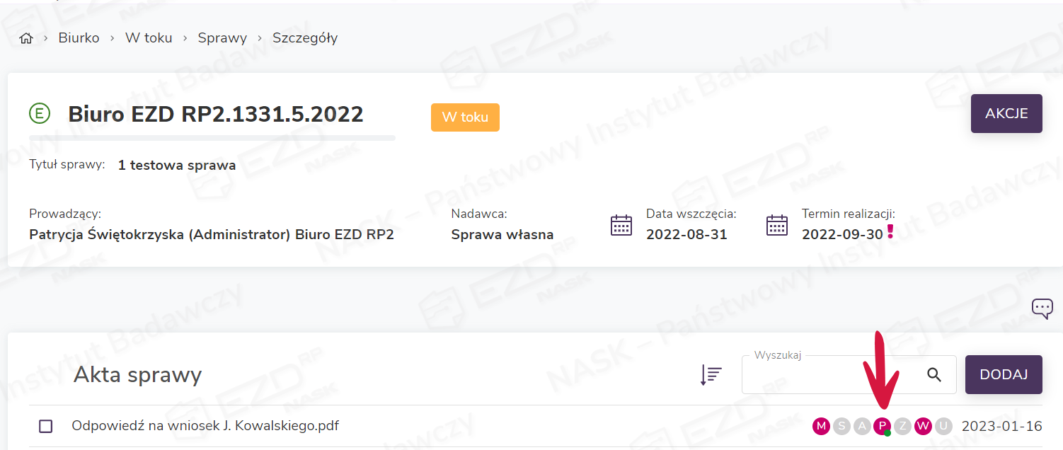 Szczegóły podpisu i akceptacji zostaną wyświetlone w panelu bocznym po kliknięciu aktywnej ikony statusu P – podpis. Analogiczne działanie dotyczy ikony z literą A – akceptacja. Więcej informacji dotyczących procesu akceptacji można znaleźć w artykule Akceptacja dokumentów w sprawie.