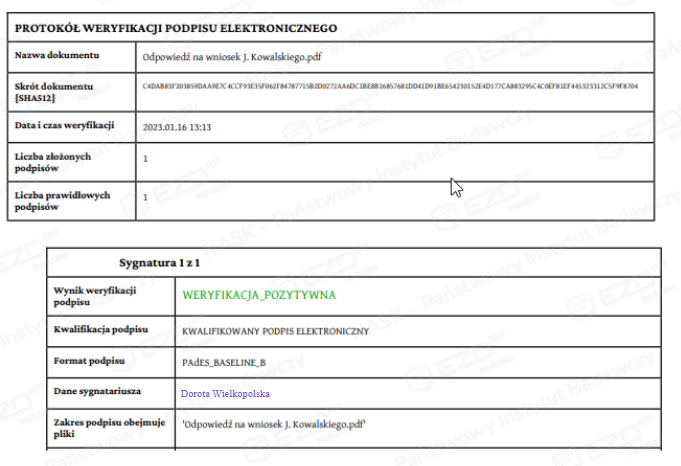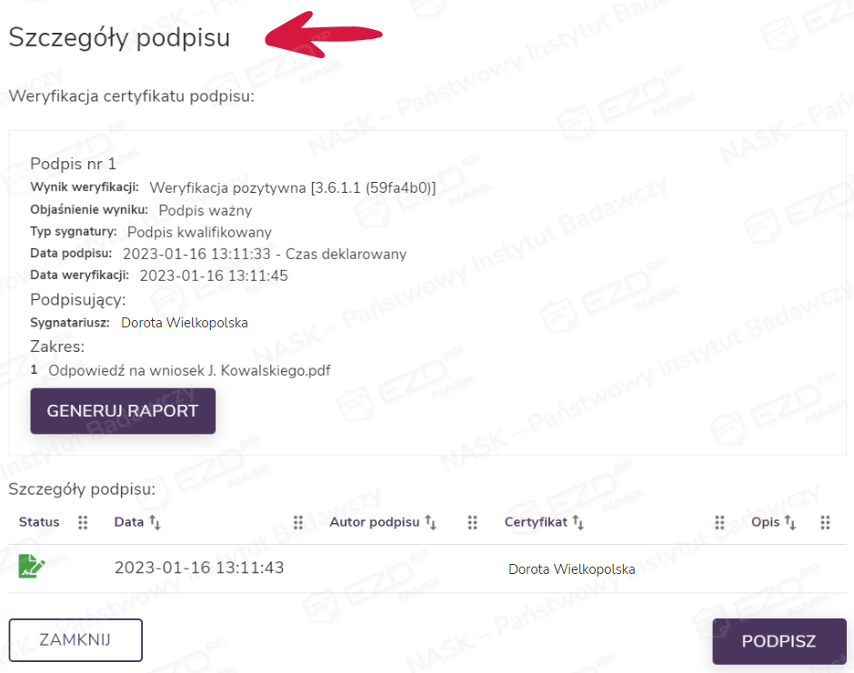 System umożliwia również wygenerowanie raportu z weryfikacji podpisu. Po kliknięciu przycisku Generuj raport do akt sprawy zostanie dodany dokument z protokołem weryfikacji podpisu elektronicznego (raport weryfikacji zostaje dołączony pod podpisany dokument).