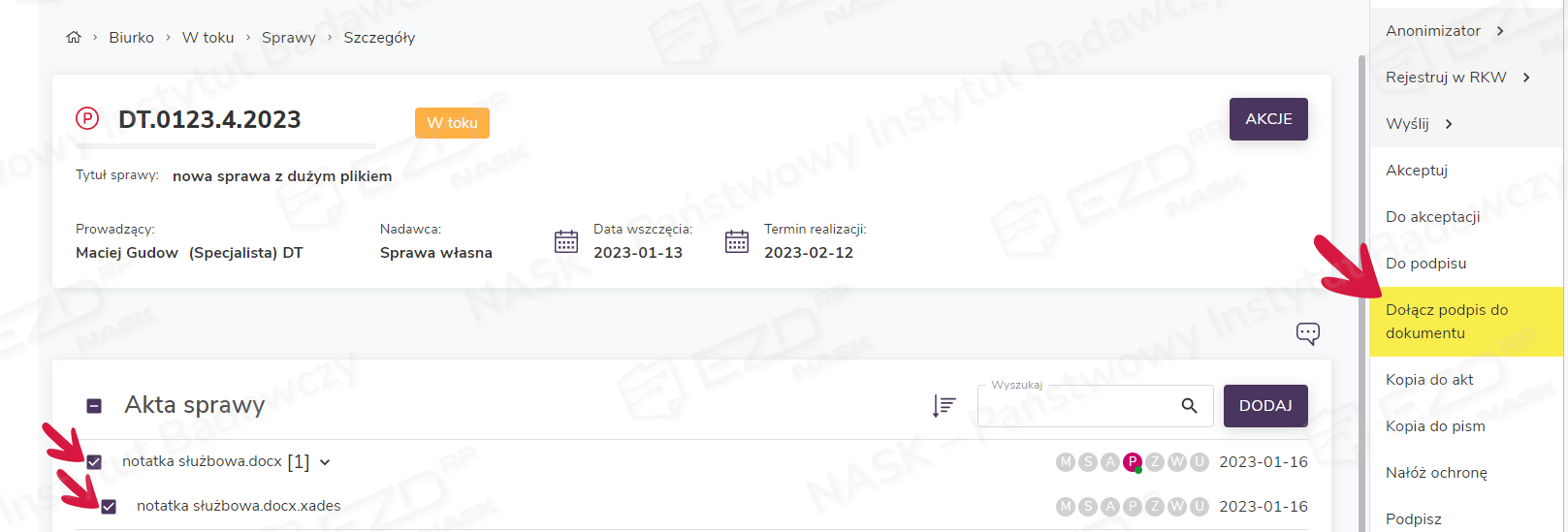 Gdy w aktach sprawy znajdują się dwa pliki (osobno dokument i podpis), można dodać podpis do dokumentu. W tym celu należy zaznaczyć oba pliki, a następnie w menu kontekstowym kliknąć opcję Dołącz podpis do dokumentu.