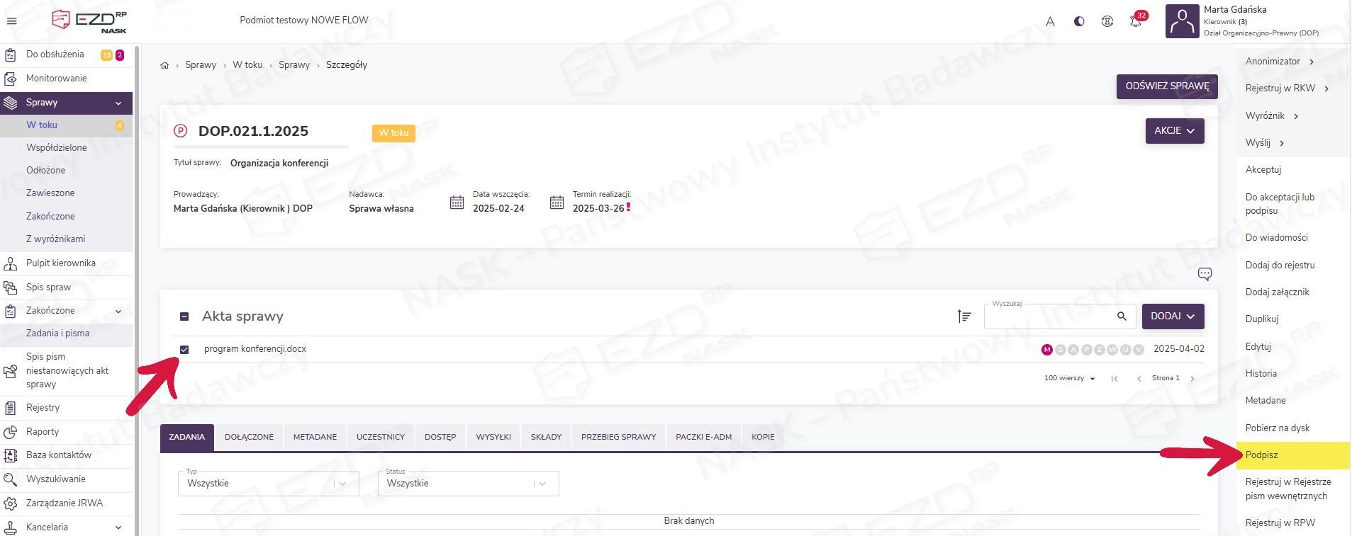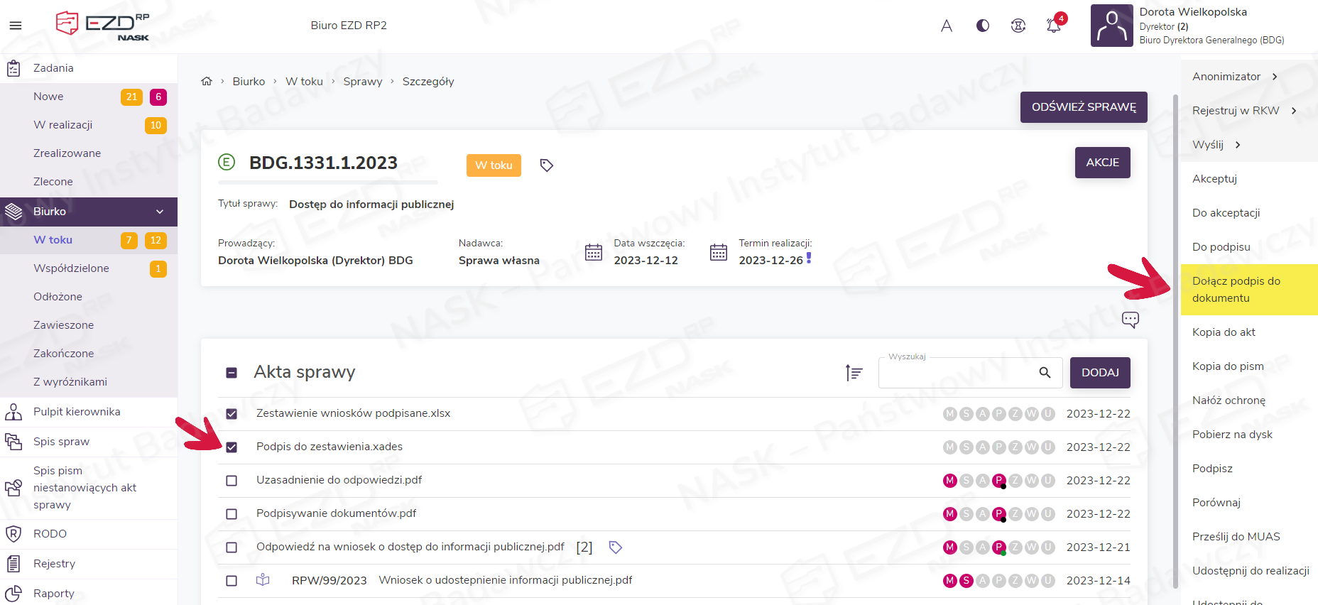 W systemie EZD RP istnieje możliwość podpisywania dokumentów bezpośrednio z poziomu spraw i pism. Aby móc korzystać z tej opcji, konieczne jest posiadanie na komputerze zainstalowanej aplikacji NASK Desk. Po złożeniu podpisu możliwe jest wygenerowanie raportu z tego procesu.
