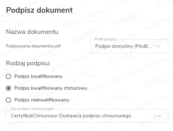 Wyświetlane w tym miejscu rodzaje podpisów mogą różnić się od widocznych na powyższej grafice – system pokaże tylko takie, które są dostępne dla danego użytkownika. Z opcji podpisu chmurowego będzie można skorzystać w przypadku, gdy administrator podmiotu wykona odpowiednie konfiguracje w module Administracja.