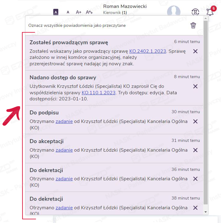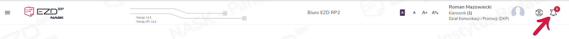 System EZD RP wykorzystuje moduł automatycznego generowania powiadomień. Są one widoczne po zalogowaniu użytkownika i sygnalizowane w menu górnym pod symbolem alarmu (ikona dzwonka wraz licznikiem informującym o liczbie nieprzeczytanych powiadomień).