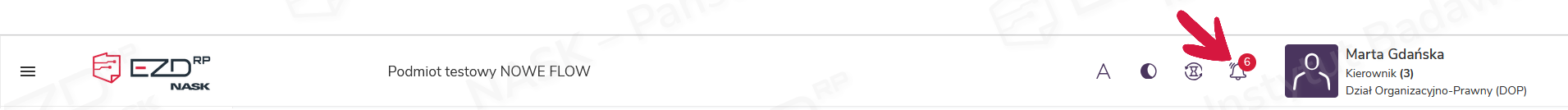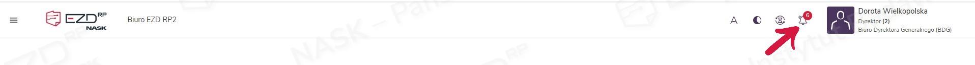 System EZD RP wykorzystuje moduł automatycznego generowania powiadomień. Są one widoczne po zalogowaniu użytkownika i sygnalizowane w menu górnym pod ikoną dzwonka wraz licznikiem informującym o liczbie nieprzeczytanych powiadomień.