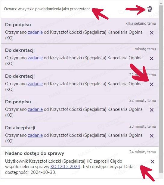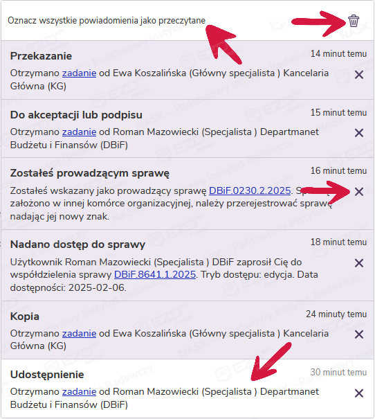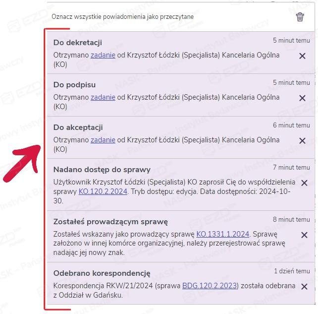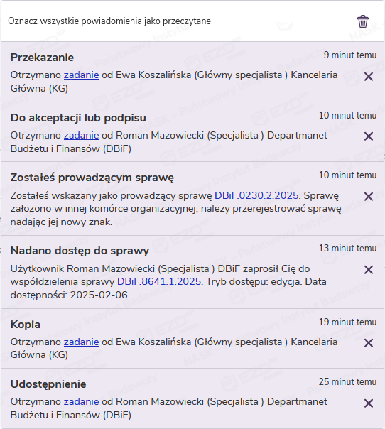 Po kliknięciu ikony dzwonka pojawia się okno z listą otrzymanych powiadomień. Każda pozycja na liście zawiera tytuł i informację o czasie przyjścia powiadomienia. W niektórych powiadomieniach, np. dotyczących spraw lub otrzymanych zadań, w treści znajdują się także dane nadawcy oraz odnośnik pozwalający przejść do akt sprawy lub szczegółów zadania.