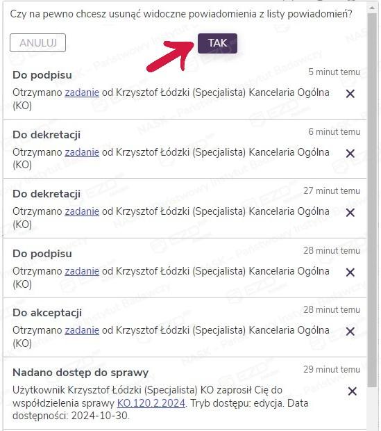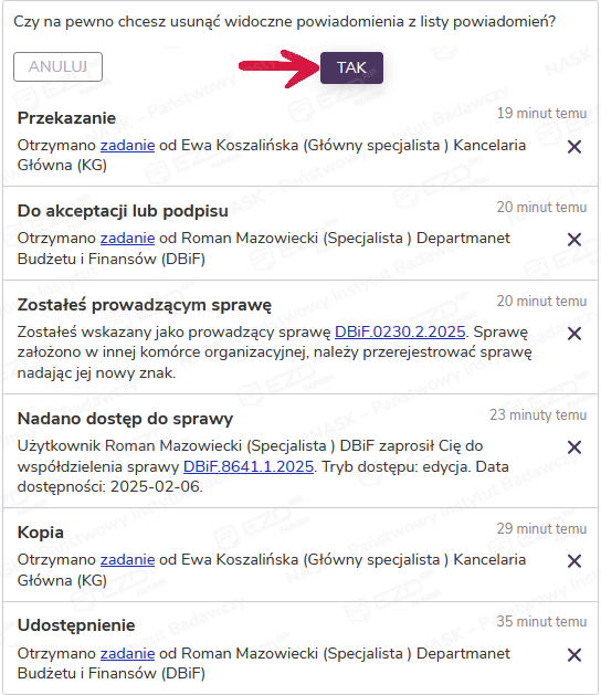 Aby potwierdzić czynność usunięcia powiadomień z listy, należy kliknąć przycisk Tak.