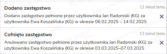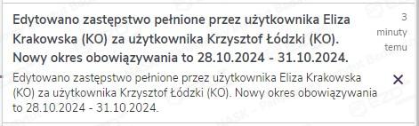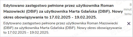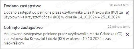 • W przypadku wprowadzenia zmiany w typie zastępstwa zarówno użytkownik zastępowany, jak i osoba zastępująca otrzymują odpowiednie powiadomienie.