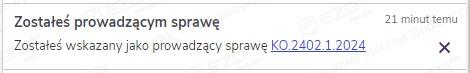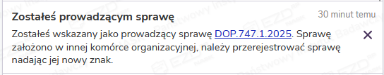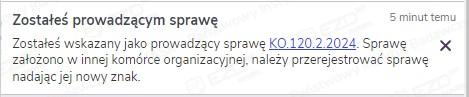 Jeśli pracownik wskazany jako osoba prowadząca sprawę będzie zatrudniony w innej komórce organizacyjnej w treści powiadomienia zostanie ujęta informacja o konieczności przerejestrowania sprawy.