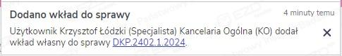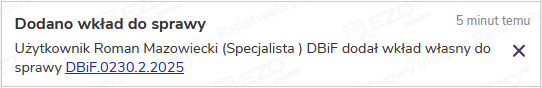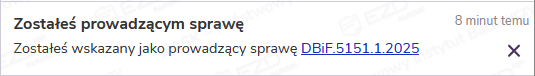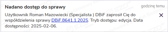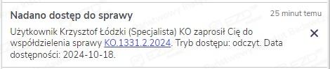 • Powiadomienie otrzyma użytkownik, któremu inny pracownik nadał dostęp do sprawy w toku. Funkcję wykorzystuje się do współdzielenia prowadzonych spraw. W powiadomieniu dostępny jest odnośnik umożliwiający przejście do widoku szczegółów danej sprawy.