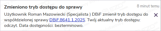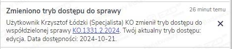 • Jeżeli pracownik prowadzący sprawę wprowadzi zmiany w trybie dostępu do niej, współdzielący ją użytkownik otrzyma stosowne powiadomienie.