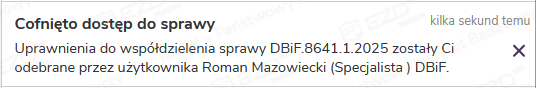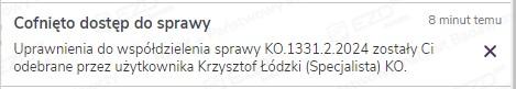 • Gdy prowadzący sprawę cofnie dostęp do niej, pracownik, który ją współdzielił, otrzyma powiadomienie o odebraniu uprawnienia.