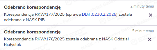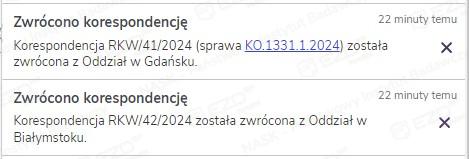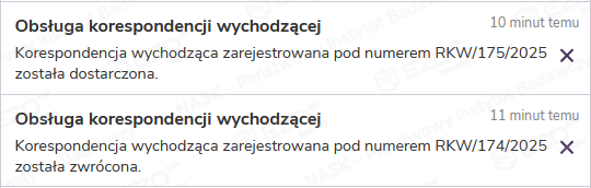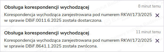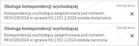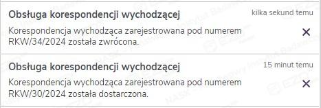 • Powiadomienia dotyczące korespondencji zarejestrowanej z poziomu Rejestru Korespondencji Wychodzącej