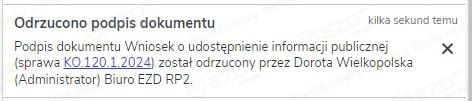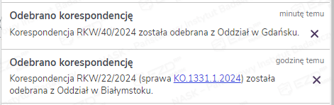 • Pracownik, który zarejestrował wysyłkę korespondencji, otrzyma powiadomienie, gdy we wskazanej lokalizacji zostanie wydrukowane Potwierdzenie odbioru osobistego. Powiadomienie pojawi się wyłącznie przy pierwszym wydruku ww. potwierdzenia. Znak sprawy w powiadomieniu oznacza, że korespondencja została zarejestrowana z poziomu szczegółów sprawy, natomiast obecność samego numeru RKW informuje, że korespondencję zarejestrowano w Rejestrze Korespondencji Wychodzącej.