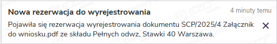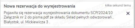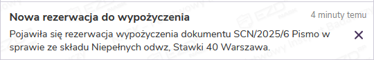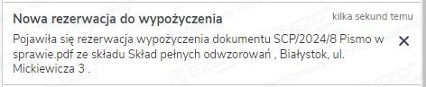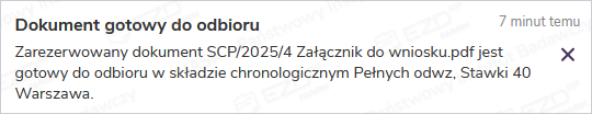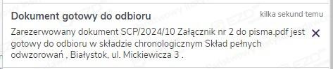 • Pracownik kancelarii, oznaczając zamówiony dokument jako gotowy do odbioru, generuje powiadomienie w systemie. Otrzymuje je pracownik składający wniosek o wypożyczenie lub wyrejestrowanie dokumentu ze składu.