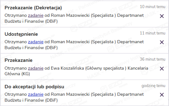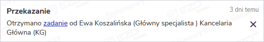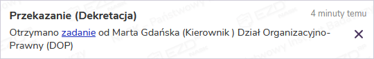 • Jest to powiadomienie pojawiające się na koncie osoby, która otrzymała zadanie. Może to być obiekt należący do kategorii Przekazanie lub Przekazanie (Dekretacja), np. w przypadku przesyłki wpływającej, ale również Udostępnienie dokumentów lub zadanie Do akceptacji lub podpisu. W treści takiego powiadomienia znajduje się odnośnik pozwalający przejść do widoku, w którym realizowane jest zadanie.