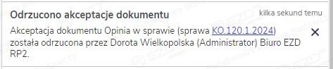 • Powiadomienie pojawia się na koncie osoby, która wystawiła zadanie Do podpisu, a ono z jakiegoś powodu zostało odrzucone.