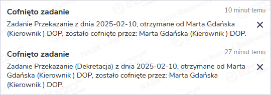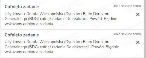• Powiadomienie pojawia się na koncie osoby, która wystawiła zadanie Do dekretacji lub Do realizacji, a osoba je odbierająca wybrała opcję Cofnij.