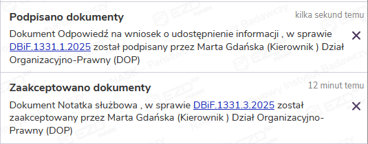 • Powiadomienie pojawia się na koncie użytkownika, który wystąpił z prośbą o akceptację lub podpisanie dokumentu i zadanie zostało pozytywnie zrealizowane w systemie.