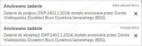 • Powiadomienie pojawia się na koncie osoby, która wystawiła zadanie Do podpisu lub Do akceptacji, a osoba je odbierająca wybrała opcję Anuluj.