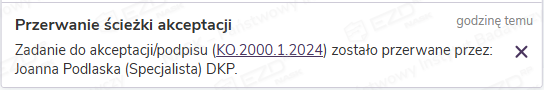 • Powiadomienie pojawia się na koncie osoby, która wystawiła zadanie Do akceptacji lub podpisu, ustalając ścieżkę obiegu – w przypadku gdy odbiorca zadania wybrał dostępną w Akcjach opcję Przerwij ścieżkę akceptacji.