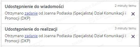 • Powiadomienie otrzyma użytkownik, który utworzył zadanie Udostępnienia do realizacji i otrzymał przygotowany przez wskazanego pracownika wkład własny do udostępnionych dokumentów.