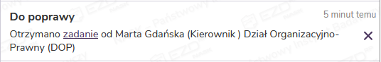 • Powiadomienie pojawia się na koncie osoby, która wystawiła zadanie Do podpisu – w przypadku gdy odbiorca zadania zwrócił zawarte w nim dokumenty do poprawienia.
